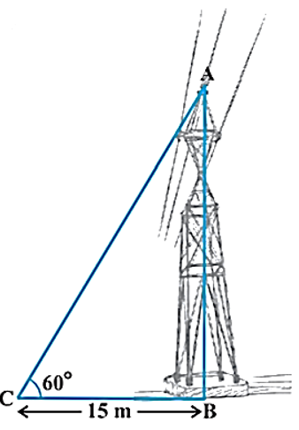 धरती पर एक मीनार ऊध्ध्वाधर खड़ी है। धरती के एक बिंदु से, जो मीनार के पाद$-$बिंदु से $15 m$ दूर है, मीनार के शिखर का उन्नयन कोण $60^\circ$ है। मीनार की ऊँचाई ज्ञात कीजिए।