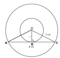 दो संकेंद्रीय वृत्तों में से बाहरी वृत्त की त्रिज्या $5 \ cm$ है तथा इसकी $8 \ cm$ लंबी जीवा $AC$ आंतरिक वृत्त की स्पर्श रेखा है। आंतरिक वृत्त की त्रिज्या ज्ञात कीजिए।