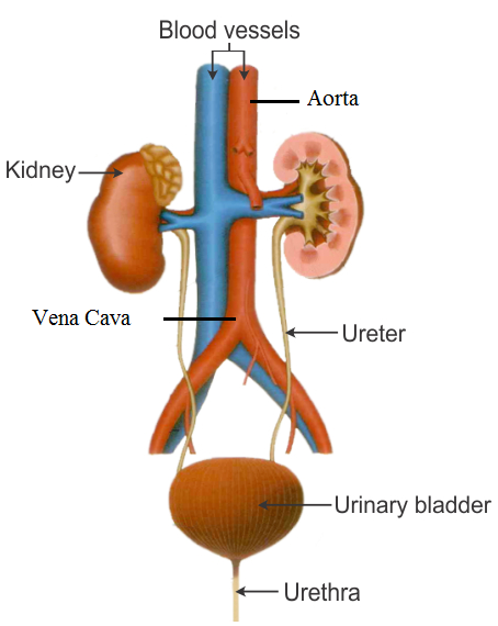 Draw a diagram of excretory system in human beings and label on it: Aorta, Vena cava, Urinary bladder, Urethra.