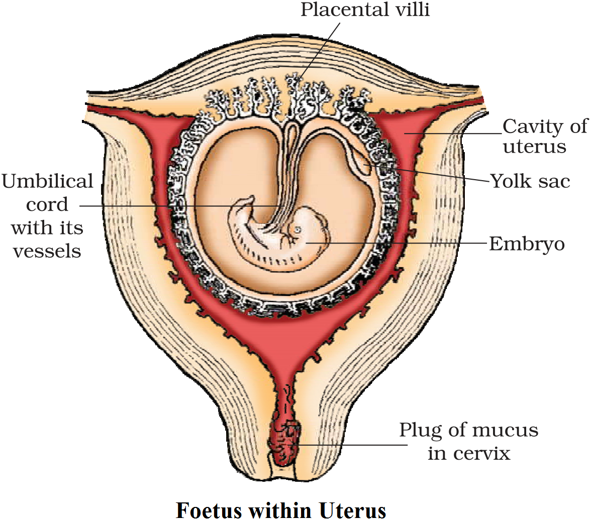 Draw a diagram showing a developing foetus within the uterus and label six parts in it.