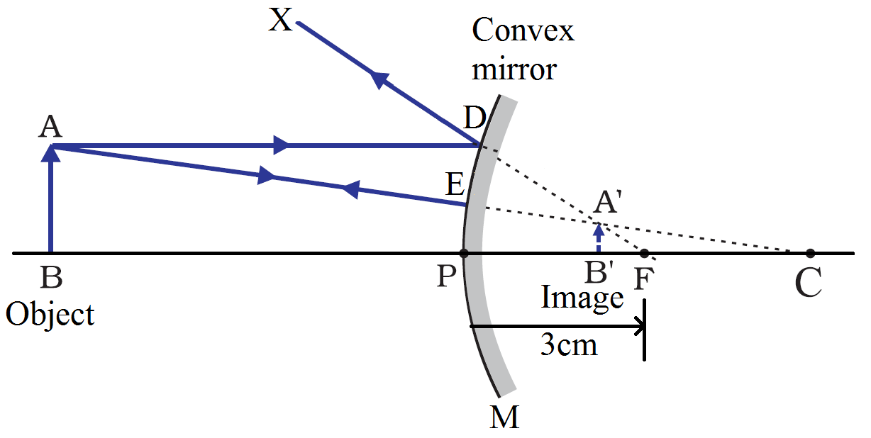Draw a diagram to represent a convex mirror. On this diagram mark principal axis, principal focus F and the centre of curvature C if the focal length of convex mirror is 3cm.