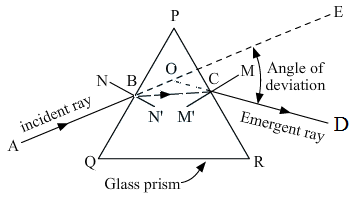 Draw a diagram to show the refraction of light through a glass prism. On this diagram, mark: