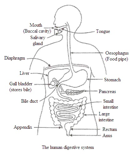 Digestion of food in human beings: Digestion of food begins in the mouth. The mouth cavity contains teeth, tongue and salivary glands. The teeth cut the food into small pieces, chew and grind it. This is called physical digestion. Salivary glands produce saliva which mixes with the food. This involves chemical digestion of food. The saliva contains an enzyme called salivary amylase which digests the starch and converts it into maltose sugar. Mouth opens into a small funnel shaped area called pharynx which leads to a long tube called oesophagus. It carries the food down into the stomach.