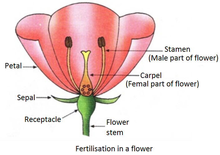 Draw a neat diagram of a flower showing its various parts. In this diagram mark stem, receptacle, sepals, petals, stamen and carpel.