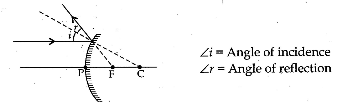 Draw a ray diagram to show the path of the reflected ray corresponding to an incident ray which is directed parallel to the principal axis of a convex mirror. Mark on it the angle of incident and the angle of reflection.