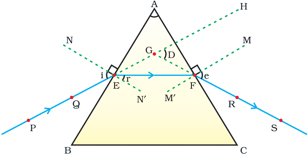 Draw a ray diagram to show the refraction of light through a glass prism. Mark on it,
