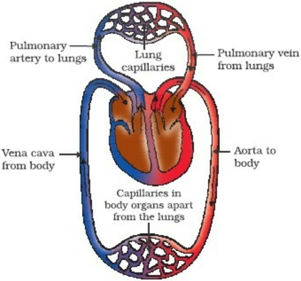 Draw a schematic representation of transport and exchange of oxygen and carbon dioxide during transportation of blood in human beings and label on it, Lung capillaries, Pulmonary artery to lungs Aorta to body, Pulmonary veins from lungs.