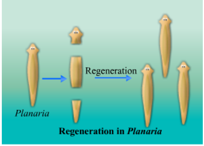 Planaria is a type of flatworm. It has the amazing capacity to regenerate its lost body part. When the flatworm is cut horizontally, separating the head from the tail, the tail will regenerate the lost head and the head will regenerate the lost tail. This process is known as regeneration. The diagram illustrating the process of regeneration in Planaria is given below.