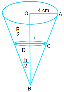 मान लीजिए कि h दिये हुए शंकु की ऊँचाई है। इस शंकु को अक्ष के मध्य-बिंदु से होकर आधार के समांतर समतल द्वारा दो भागों में विभाजित करने पर, हमें निम्नलिखित प्राप्त होता है। (देखिए आकृति)