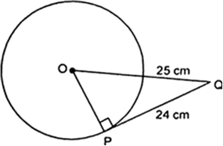 एक बिंदु $Q$ से एक वृत्त पर स्पर्श रेखा की लंबाई $24 \ cm$ तथा $Q$ की केंद्र से दूरी $25 \ cm$ है। वृत्त की त्रिज्या है: