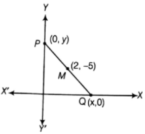 एक रेखा $y-$अक्ष और $x-$अक्ष को क्रमशः बिंदुओं $P$ और $Q$ पर प्रतिच्छेद करती है। यदि, $(2, -5)$ रेखाखंड $PQ$ का मध्य$-$बिंदु है, तो $P$ और $Q$ के निर्देशांक क्रमशः हैं: