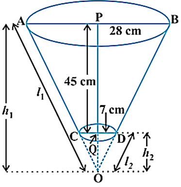 हमें $r_1 = 28 \ cm, r_2 = 7 \ cm$ और छिन्नक की ऊँचाई $(h) = 45 \ cm$ दिए हुए हैं। साथ ही
