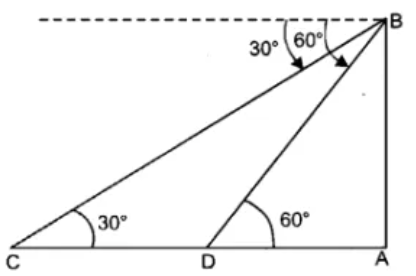 माना $AB,$ मीनार की ऊँचाई को व्यक्त करता है। $C$ और $D$ कार की दो स्थितियों को दर्शाते हैं।