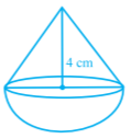 $= \left(\frac{2}{3} \times \frac{22}{7} \times 4^{3}+\frac{1}{3} \times \frac{22}{7} \times 4^{2} \times 4\right) cm^3 = \frac{1408}{7} cm^3$