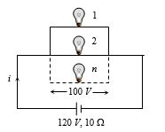 Electric bulb $50\, W$ - $100\, V$ glowing at full power are to be used in parallel with battery $120\, V$, $10 \,\Omega$. Maximum number of bulbs that can be connected so that they glow in full power is