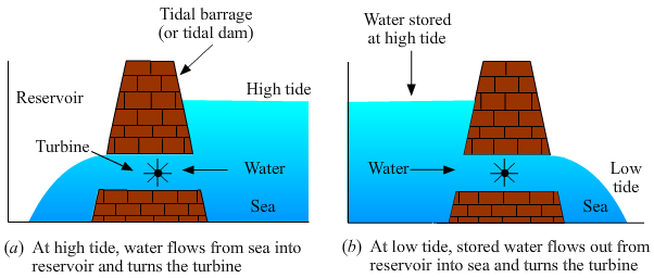 During high tide, when the level of water in the sea is high, sea-water flows into the reservoir of the barrage and turns the turbines. The turbines then turn the generator to produce the electricity. And during the low tide, when the level of sea-water is low, the sea-water stored in the barrage reservoir is allowed to flow out into the sea. This flowing water also turns the turbines and generates electricity.