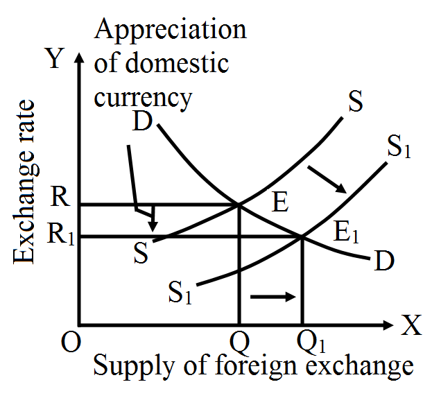 Price of foreign exchange refers to foreign exchange rate. So, when there is an increase in supply of foreign exchange, keeping demand for foreign exchange constant, then this causes a fall in the foreign exchange rate. Hence, it leads to appreciation of domestic currency.