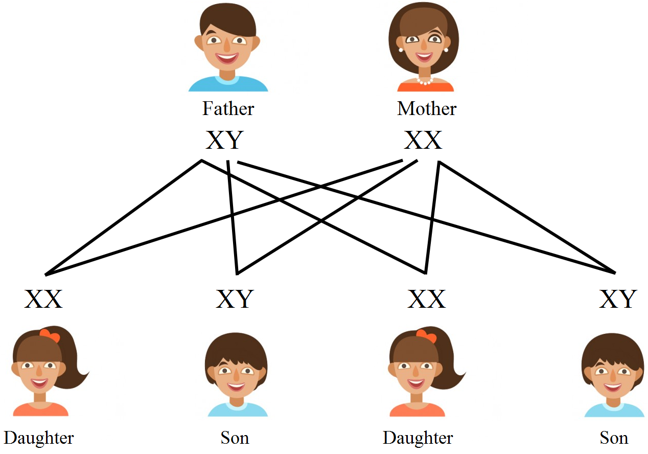 Women have a perfect pair of sex chromosomes XX. But men have a mismatched pair of chromosomes in the form XY. This cell is divided meiotically in both men and women to form gametes. All children will inherit an X chromosome from their mother regardless of whether they are boys or girls and an X or Y chromosomes from their father. Thus, the sex of the children will be determined by what they inherit from their father. A child who inherits an X chromosome from her father will be a girl, and one who inherits a Y chromosome from him will be a boy.