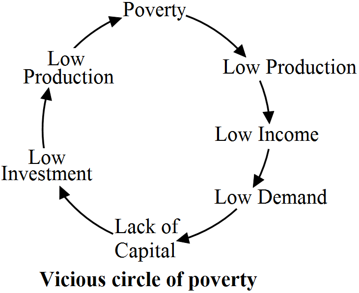 Vicious circle of poverty implies that poverty is the cause of poverty. There are many vicious circles of poverty. One of them is depicted below: