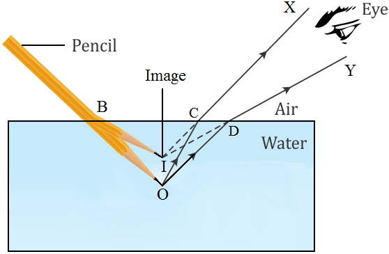 A pencil half immersed in water at an angle apperas bent due to refraction of light ar the air water surface. Figure shows a straight pencil AO whose lower portion BO is immersed in water. it appears to be bent at point B in the direction BI. A ray of light OC coming from the lower end O passes from water into air at C and gets refracted away from the normal in the direction CX Another ray OD gets refracted in the direction DY. The two refracted ray CX and DY, when produced backward, appear to meet at point I, nearer to the water surface than O Similarly each part of the immersed portion of the pencil raides. As A result immersed portion of the pencil appears to be bent when viewed at an angle from outside.