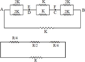 A composite rod made of three rods of equal length and cross-section as shown in the fig. The thermal conductivities of the materials of the rods are $K/2, 5K$ and $K$ respectively. The end $A$ and end $B$ are at constant temperatures. All heat entering the face Agoes out of the end $B$ there being no loss of heat from the sides of the bar. The effective thermal conductivity of the bar is