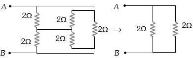 In the circuit diagram shown, each battery is ideal having an e.m.f. of $1\ volt$. Each resistor has a resistance of $1\Omega $ Ammotor$(A)$ has a resistance of $1\Omega $ Find the reading of the ammeter and the total thermal power produced in the circuit