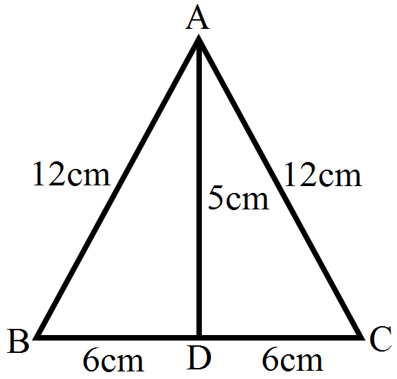 In $\triangle\text{ADB},$ $\text{AB}^2=\text{AD}^2+\text{BD}^2$ (By applying pythagoras theorem) $\text{AD}^2=\text{AB}^2-\text{BD}^2$ $\text{AD}^2=\Big[(12)^2-(6)^2\Big]\text{cm}^2$ $\text{AD}^2=\sqrt{108}\text{cm}$ $\text{AD}=\sqrt{108}\text{cm}=6\sqrt{3}\text{cm}$ Hence the height of the triangle is $6\sqrt{3}\text{cm}$