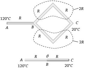 Five identical rods are joined as shown in figure. Point $A$ and $C$ are maintained at temperature $120^o C$ and $20^o C$ respectively. The temperature of junction $B$ will be....... $^oC$