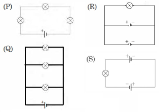 Following figures show different combinations of identical bulb$(s)$ connected to identical battery$(ies)$. Which option is correct regarding the total power dissipated in the circuit?