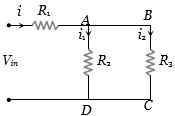 Using ${i_1} = \frac{{{R_3}}}{{{R_2} + {R_3}}}i = \frac{{{R_3}}}{{{R_3} + {R_3}}}i = \frac{1}{2}i$