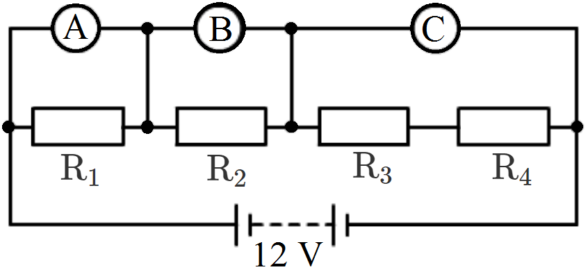 What would you expect the voltmeters $A, B$ and $C$ to read assuming that the connecting wires in the circuit have negligible resistance?
