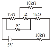 When the resistance $R$ (indicated in the figure below) is changed from $1 \,k \Omega$. to $10 \,k \Omega$, the current flowing through the resistance $R'$ does not change. What is the value of the resistor $R'?$