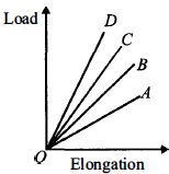 The load versus elongation graphs for four wires of same length and made of the same material are shown in the figure. The thinnest wire is represented by the line