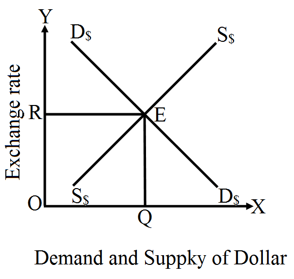 The diagram shows that demand for dollar $(D)$ and supply of dollar $(S)$ curves intersect each other at point $E.$