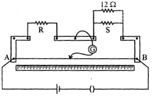 In a meter bridge, the null point is found at a distance of 40 cm from A. If a resistance of 12 Ω is connected in parallel with S, the null point occurs at 50.0 cm from. Determine the values of R and S.