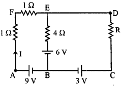 Using Kirchoffs rules determine the value of unknown resistance $R$ in the circuit so that no current flows through 4 $\Omega$ resistance. Also find the potential difference between $A$ and $D.$