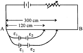 In the figure a long uniform potentiometer wire $AB$ is having a constant potential gradient along its length. The null points for the two primary cells of emfs $\varepsilon_{1}$ and $\varepsilon_{2}$
