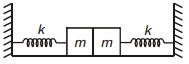 An assembly of identical spring-mass systems is placed on a smooth horizontal surface as shown. At this instant, the springs are relaxed. The left mass is displaced to the/left and theiright mass is displaced to the right by same distance and released. The resulting collision is elastic. The time period of the oscillations of system is