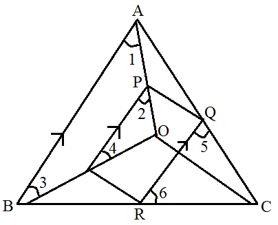 Given: In $\triangle\text{ABC},$ O is any point in the interior of $\triangle\text{ABC}.$ OA, OB, OC are joined. PQRS is a parallelogram such that P, Q, R and S lies on segments OA, AC, BC and OB and PS || AB. To prove: OC || SR Proof: In $\triangle\text{OAB}$ and $\triangle\text{OPS}$