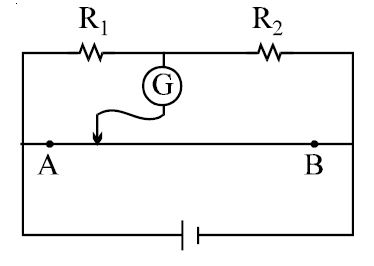 In the figure shown for gives values of $R_1$ and $R_2$ the balance point for Jockey is at $40\,cm$ from $A$. When $R_2$ is shunted by a resistance of $10\, \Omega$ , balance shifts to $50\,cm.$ $R_1$ and $R_2$ are $(AB = 1 \,m)$