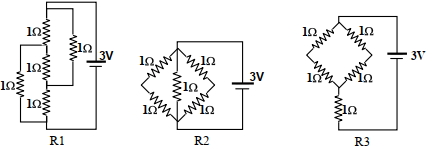 Figure shows three resistor configurations $\mathrm{R} 1, \mathrm{R} 2$ and $\mathrm{R} 3$ connected to $3 \mathrm{~V}$ battery. If the power dissipated by the configuration $\mathrm{R} 1, \mathrm{R} 2$ and $\mathrm{R} 3$ is $\mathrm{P} 1, \mathrm{P} 2$ and $\mathrm{P} 3$, respectively, then
