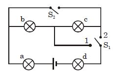 Four lamps are connected in the way shown in the figure. When switch $S_2$ is open and switch $S_1$ is on position $-2$ , lamp $-b$ is the brightest, and lamp $-c$ and lamp $-d$ are the dimmest and are of the same brightness. Now $S_2$ is closed and $S_1$ is on position $-1$ , the sequence in brightness of the lamps is (with the first in the sequence being the brightest)