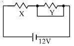 When an ammeter of negligible internal resistance is inserted in series with circuit it reads $1A$. When the voltmeter of very large resistance is connected across $X$ it reads $1V$. When the point $A$ and $B$ are shorted by a conducting wire, the voltmeter measures $10\, V$ across the battery. The internal resistance of the battery is equal to .............. $\Omega$