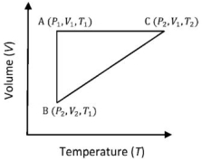 $(A)$ $q_{A C}=\Delta U_{B C}$ and $W_{A B}=P_2\left(V_2-V_1\right)$ $(B)$ $W _{ BC }= P _2\left( V _2- V _1\right)$ and $q _{ BC }= H _{ AC }$ $(C)$ $\Delta H _{ CA }<\Delta U _{ CA }$ and $q _{ AC }=\Delta U _{ BC }$ $(D)$ $q_{B C}=\Delta H_{A C}$ and $\Delta H_{C A}>\Delta U_{C A}$