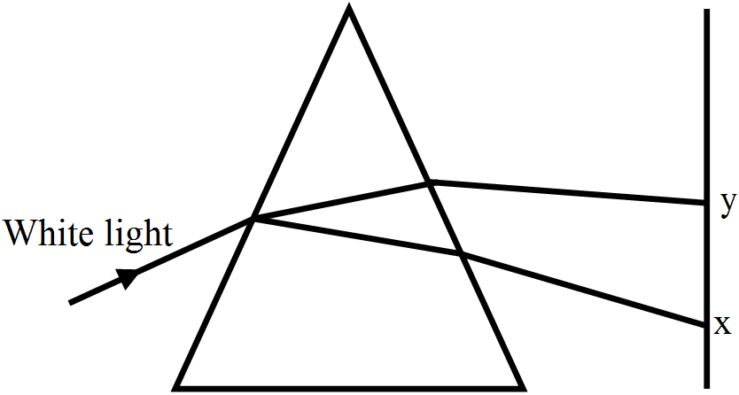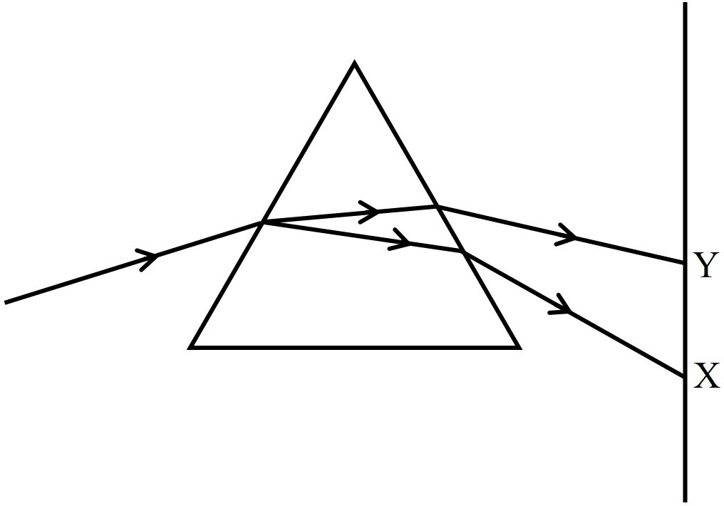 In the figure given below a narrow beam of white light is shown to pass through a triangular glass prism. After passing through the prism it produces a spectrum XY on a screen.