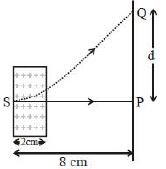 An electron, moving along the $x-$ axis with an initial energy of $100\, eV$, enters a region of magnetic field $\vec B = (1.5\times10^{-3}T)\hat k$ at $S$ (See figure). The field extends between $x = 0$ and $x = 2\, cm$. The electron is detected at the point $Q$ on a screen placed $8\, cm$ away from the point $S$. The distance $d$ between $P$ and $Q$ (on the screen) is :......$cm$ (electron's charge $= 1.6\times10^{-19}\, C$, mass of electron $= 9.1\times10^{-31}\, kg$)