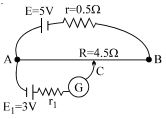 In the given potentiometer circuit length of the wire $AB$ is $3\, m$ and resistance is $R = 4.5 \, \Omega$ . The length $AC$ for no deflection in galvanometer is