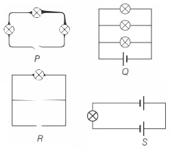 Following figures show different combinations of identical bulb$(s)$ connected to identical battery$(ies)$. Which option is correct regarding the total power dissipated in the circuit?