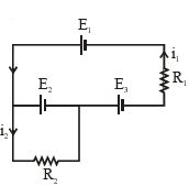 The current $i_1$ and $i_2$ through the resistors $R_1(=10\,\Omega )$ and ${R_2}\left( { = 30\,\Omega } \right)$ in the circuit diagram with $E_1 = 3\,V$, $E_2 = 3\,V$ and $E_3 = 2\,V$ are respectively