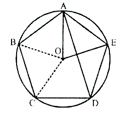 Arc AE subtends ∠AOE at the centre and ∠ADE at the remaining part of the circle. $\therefore \angle ADE =\frac{1}{2} \times 72^{\circ}$ = 36 (central angle is a regular pentagon at O) ∠ADC = ∠ADB + ∠BDC = 36° + 36° + 72° ∴ ∠ADE : ∠ADC = 36° : 72° = 1: 2